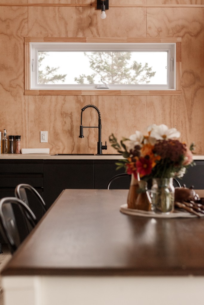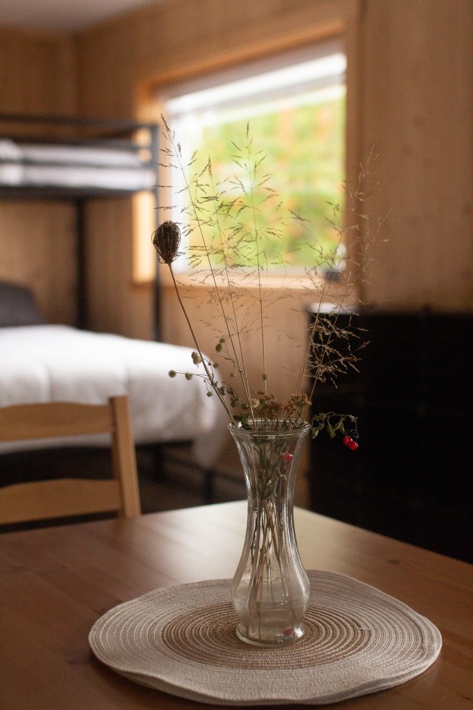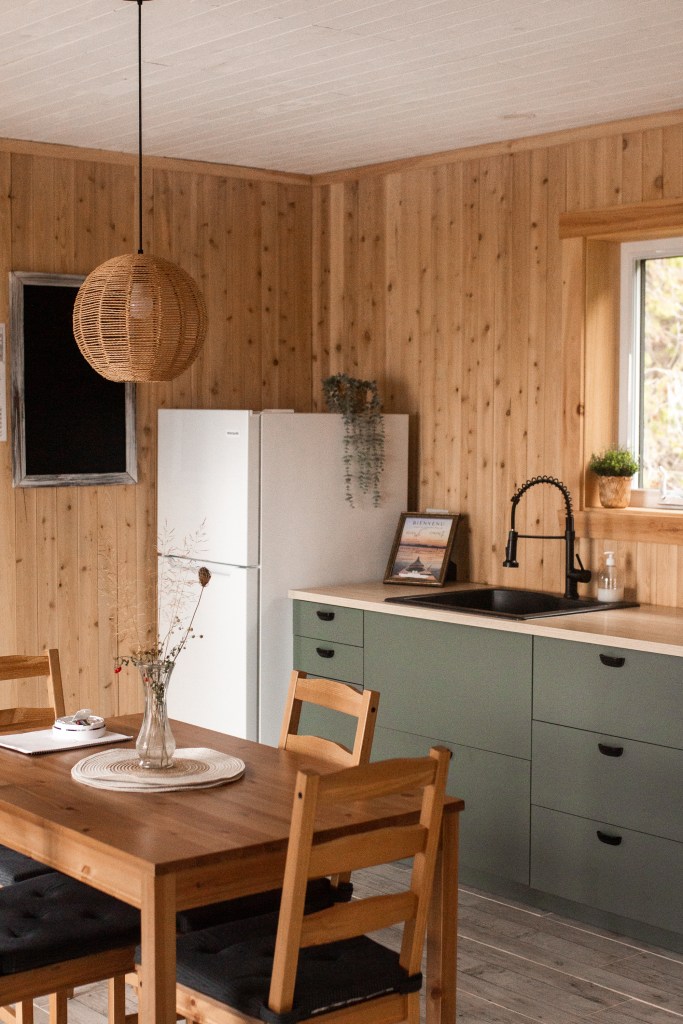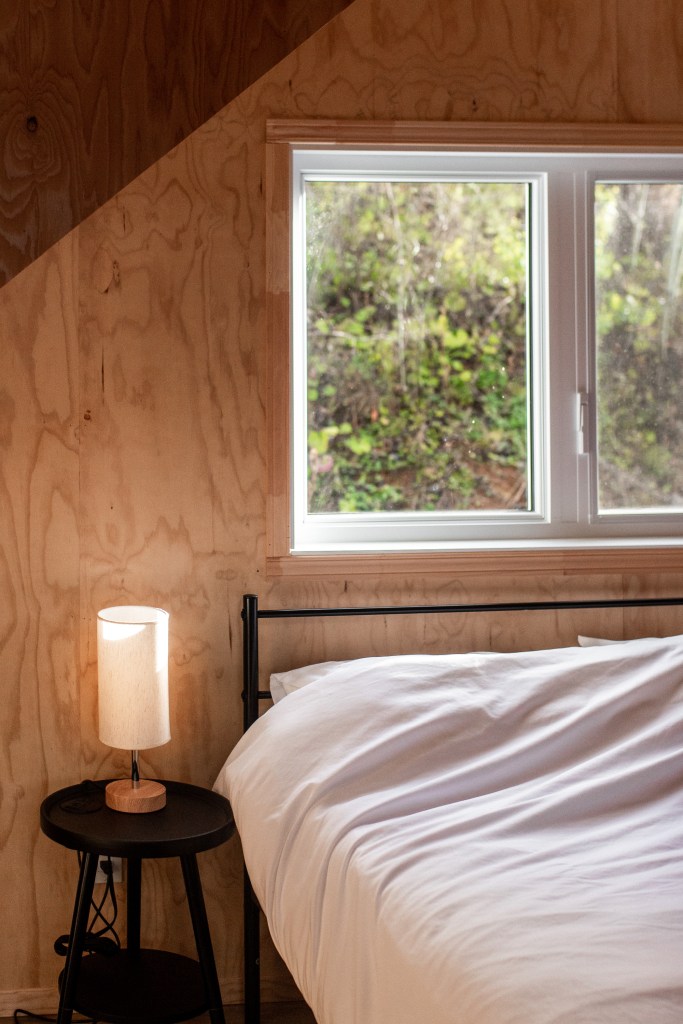 Chalet neuf et cosy pour deux personnes avec vue directe sur la baie. Vous serez entourés de forêt tout en étant à quelques pas seulement d’une plage intime et tranquille. Le chalet est conçu comme un loft à aire ouverte avec un coin chambre dotée d’un lit double, et d’un coin cuisine/salon avec futon devant la mer.